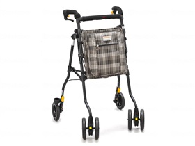 | 特徴 | 小さく折りたためる歩行器です。トレイ付きで、屋内でも使用できます。総重量4.9㎏の軽量で、トレイとトレイの受け枠を外すと折りたたむことができ、1/4サイズまで小さくできます。前輪は直進・左右40度・360度回転の3段階角度調節が可能です。 |