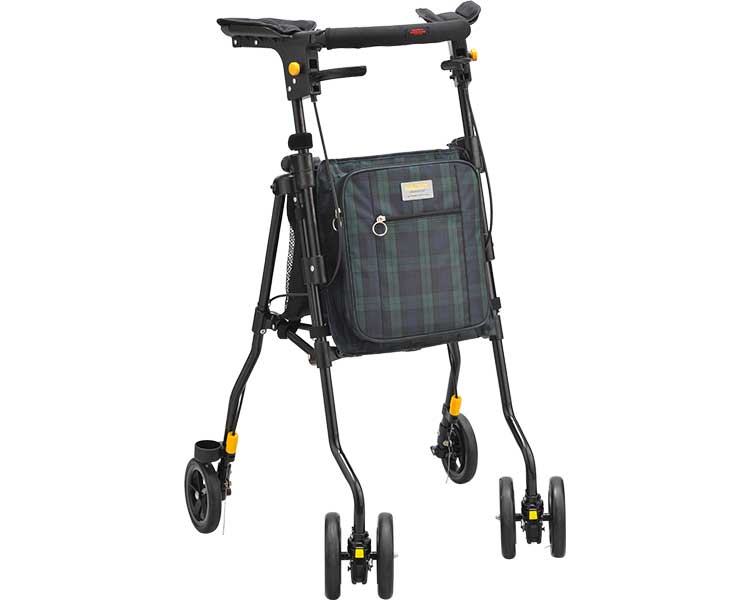 | 特徴 | 軽量でコンパクトな折りたためる前腕支持タイプの歩行器です。総重量5.3㎏と非常に軽く、折りたたむことで1/4サイズまで小さくすることができます。前輪は直進・左右40度・360度回転の3段階角度調節が可能です。 |