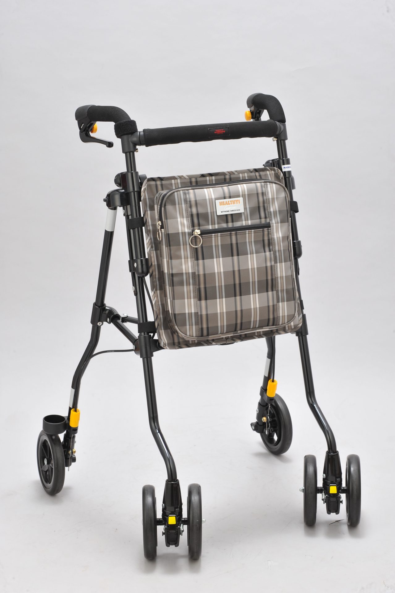 | 特徴 | 小さく折りたためる歩行器です。トレイ付きで、屋内でも使用できます。総重量4.9㎏の軽量で、トレイとトレイの受け枠を外すと折りたたむことができ、1/4サイズまで小さくできます。前輪は直進・左右40度・360度回転の3段階角度調節が可能です。 |