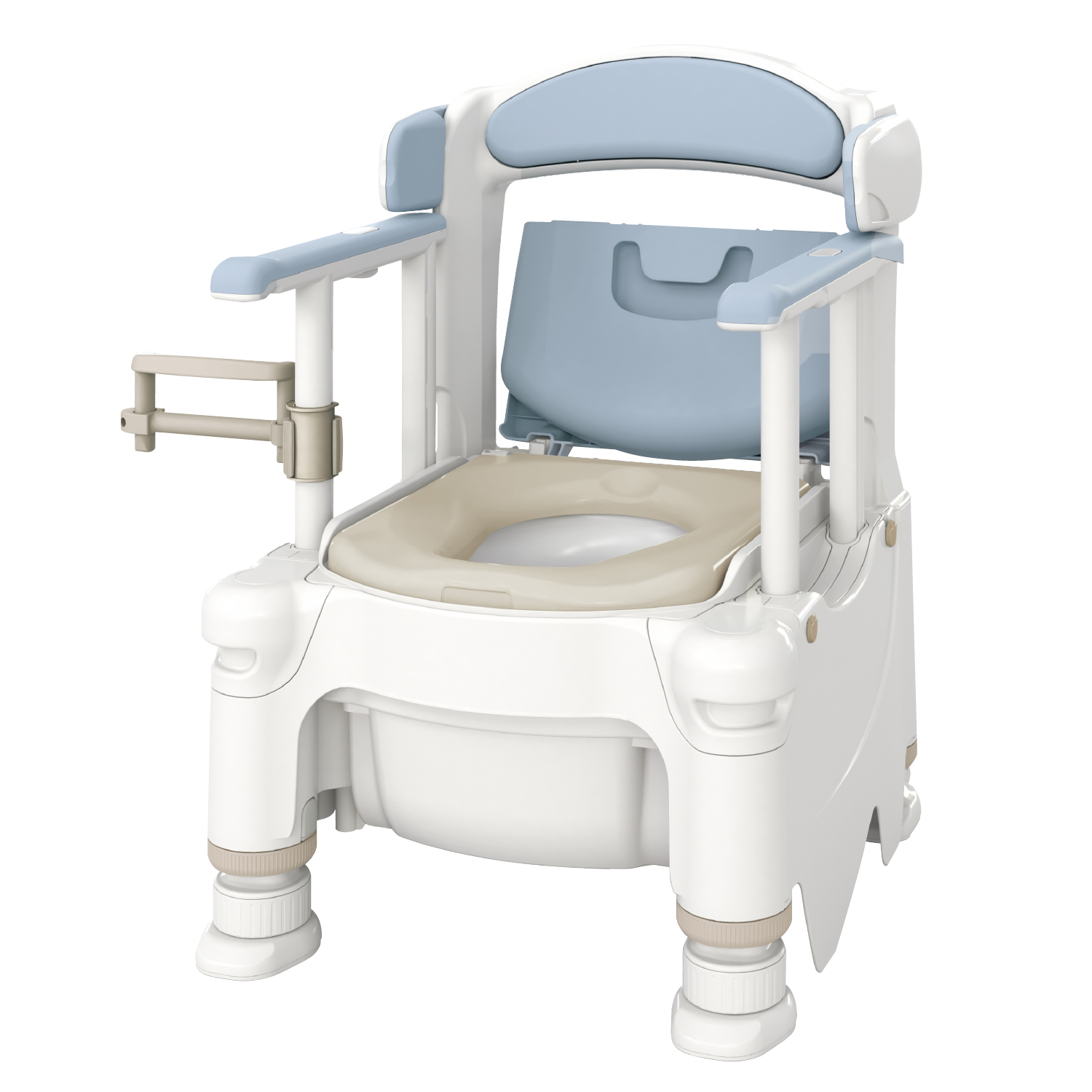 特徴移乗、排泄、後始末の3 つをサポートするポータブルトイレです。肘掛けの高さが低く設定できるため乗り移りしやすいです。側方ガードにより左右の身体の傾きを支えることができ、また姿勢保持グリップで、前かがみの姿勢がとりやすくなっています。バケツの柄は持ち上げるだけでロックされるため持ち運びでこぼれにくいです。