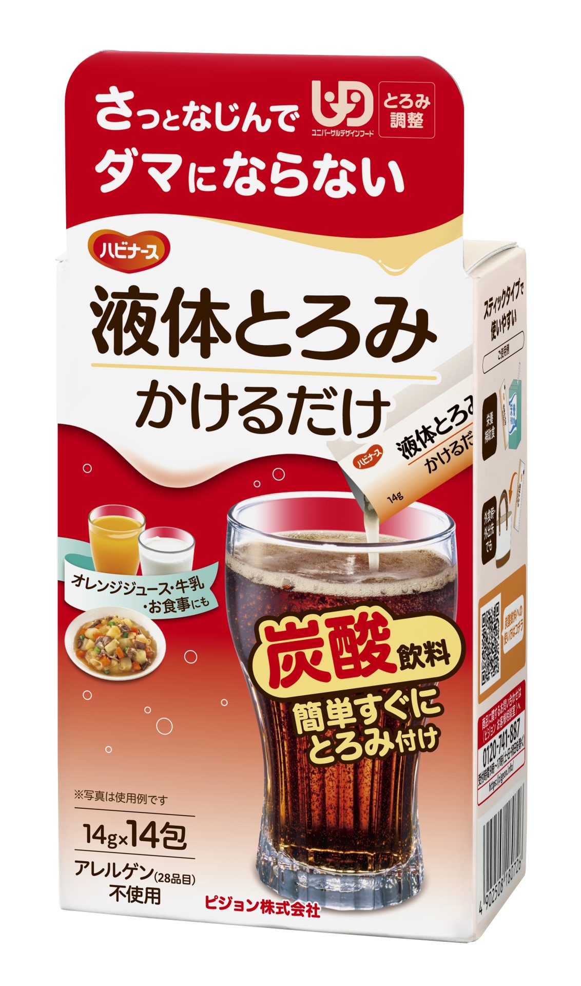 | 特徴 | 液体タイプのとろみ調整剤です。液体のためダマにならず、粉末剤ではとろみのつきにくいタンパク質の多い飲み物(栄養補助食など)や酸味の強い飲み物(オレンジジュースなど)、炭酸飲料にもすぐにとろみをつけることができます。個包装で、外出先でも使いやすいです。 |