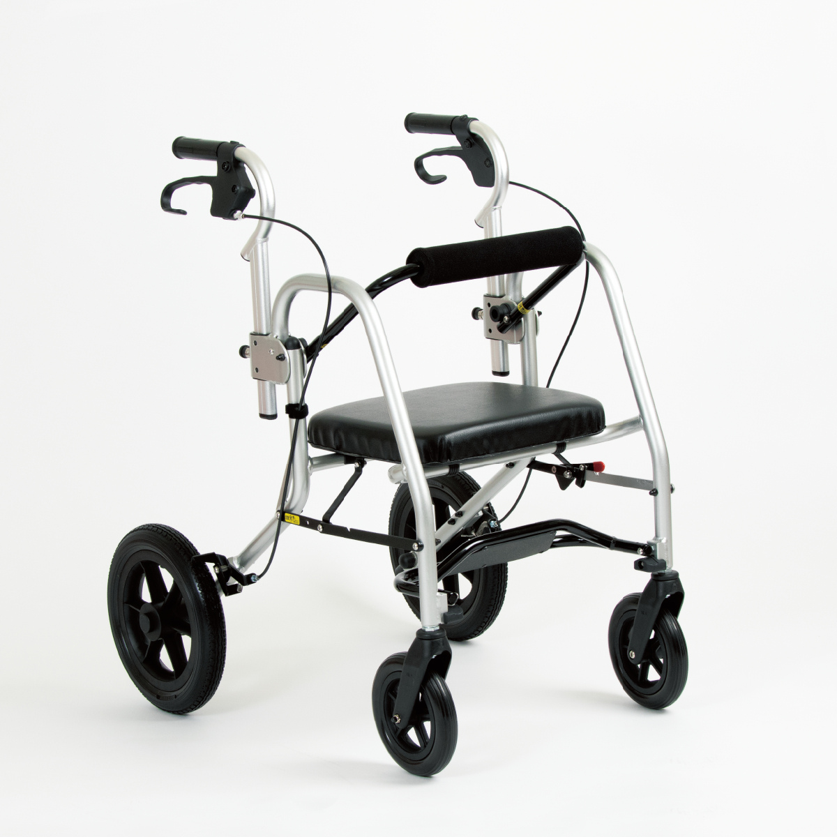 | 特徴 | 歩行器・椅子・介助用車いすの3種類の使い方が可能な歩行器です。前輪に7インチキャスターを採用し、段差も乗り越えやすいです。バックサポートが前後に反転でき、フットサポートが付いているため、前から座り車いすのように人から押してもらうことが出来ます。 |