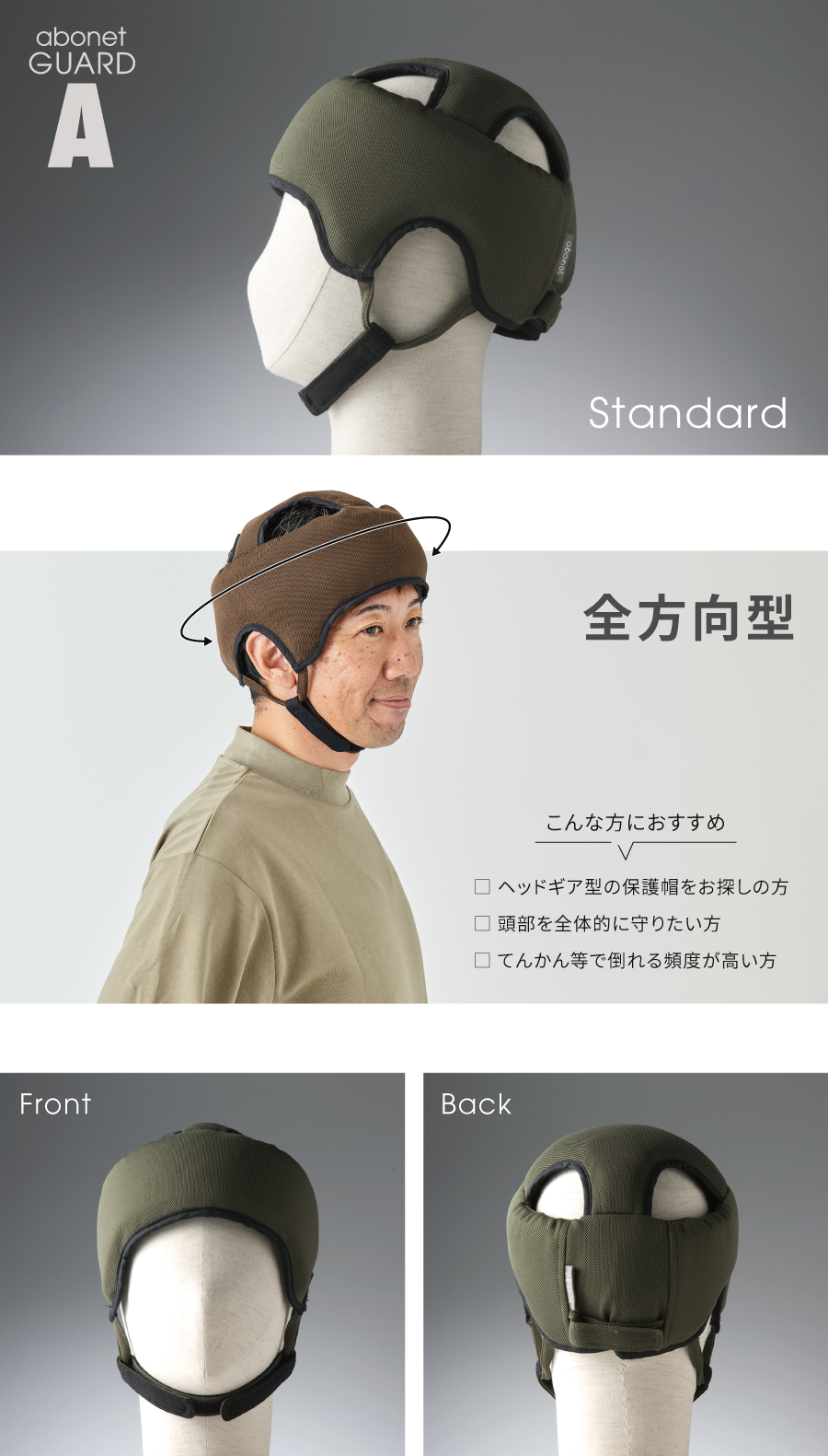 特徴ヘッドギア型の保護帽です。全体的に頭を守ります。日常的に長時間被ることを前提に、圧迫感を軽減できるようにサイズ調整ができます。
