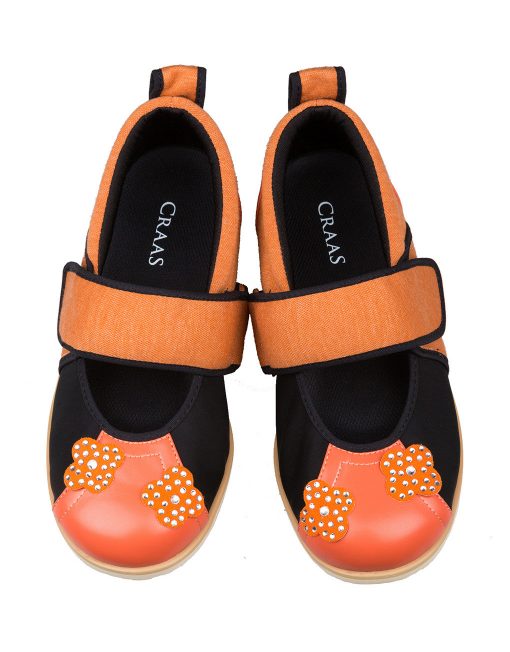 特徴ループ付きのかかと、ベルトで足の甲をしっかり支え、伸縮性のある素材で脱ぎ履きしやすい靴です。中敷きが3D形状で足をしっかり支えます。バレエシューズのような上品なデザインです。