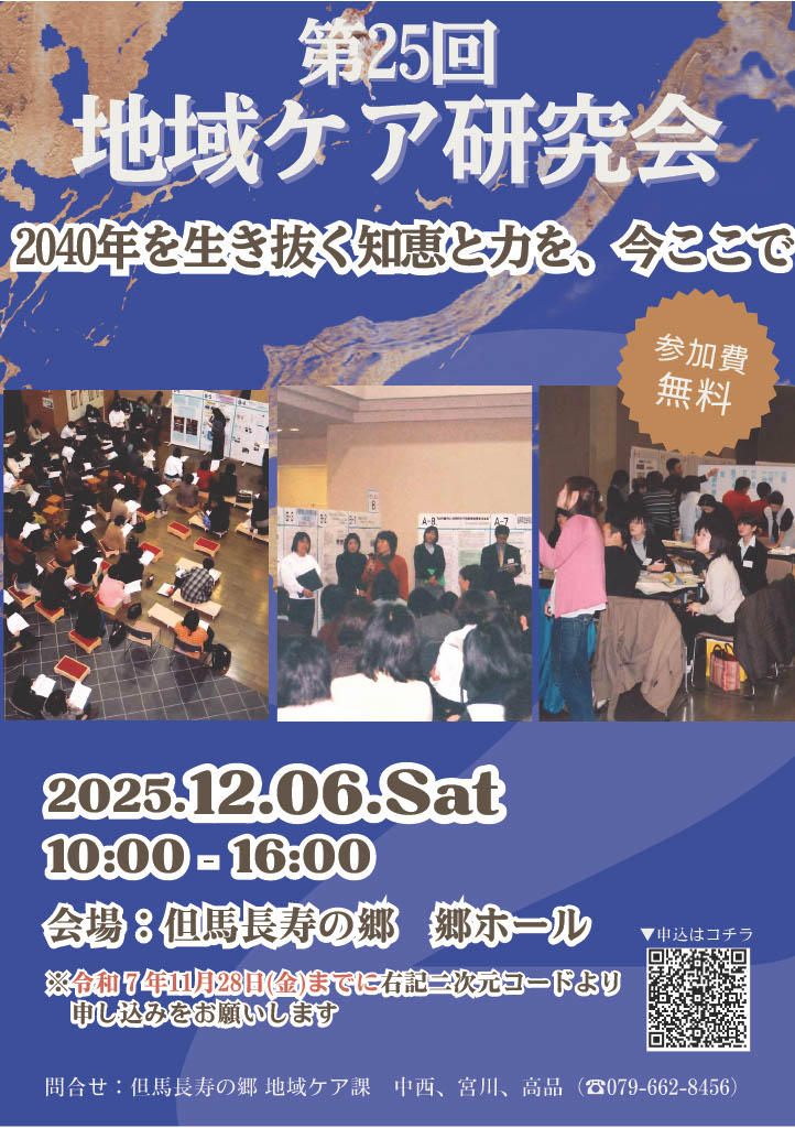 但馬長寿の郷では、但馬圏域の地域ケアスタッフが一堂に会し、実践報告と意見交換により知見を広め、資質向上を図ることを目的に地域ケア研究会を開催します。 今年度は、多分野に渡る12の演題発表を予定しています。 当日のスケジュールをご確認の上、ぜひご参加ください。